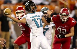 Kapolei quarterback Taulia Tagovailoa (12) throws the football as Kahuku defensive end Samson Reed (92) bears down during the first half of an HHSAA Open Division semifinal football game between the Kahuku Red Raiders and the Kapolei Hurricanes on Friday, November 11, 2016 at Aloha Stadium in Halawa.