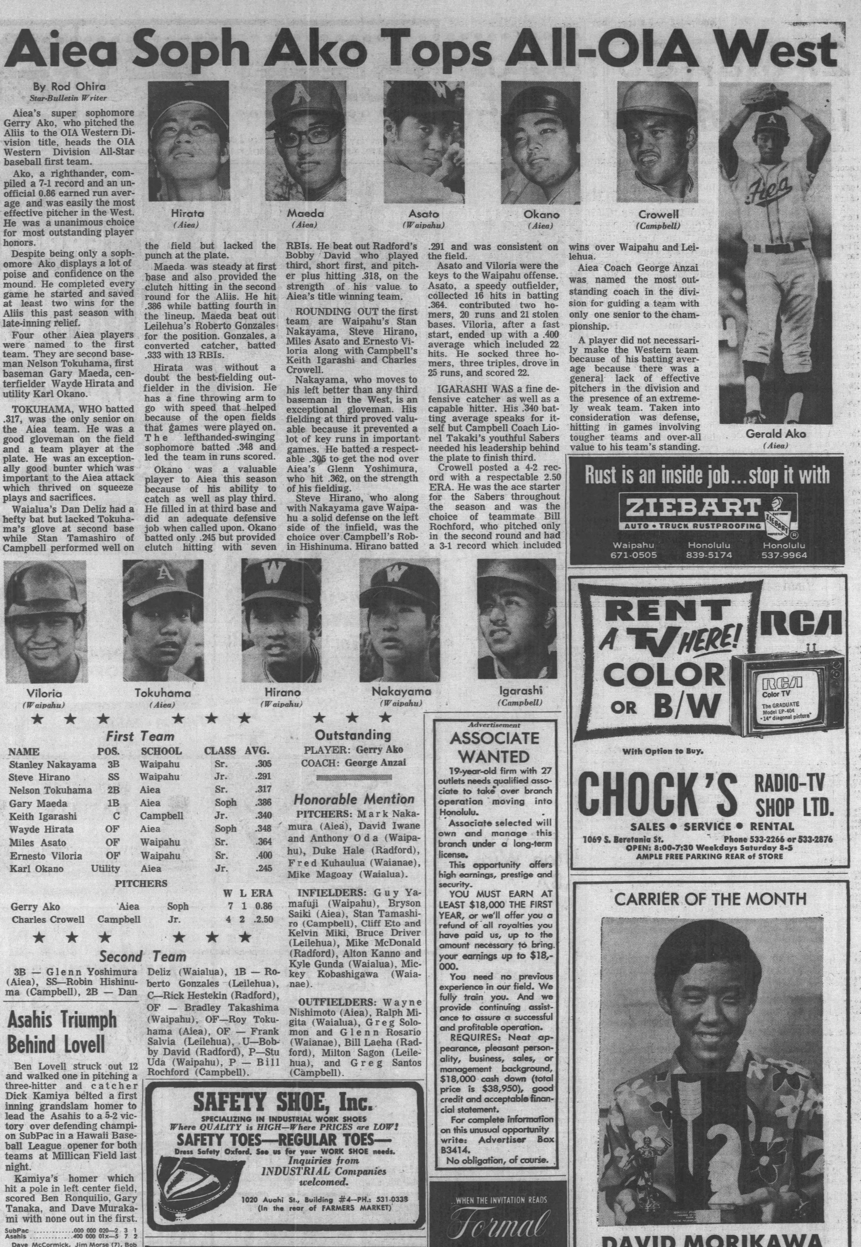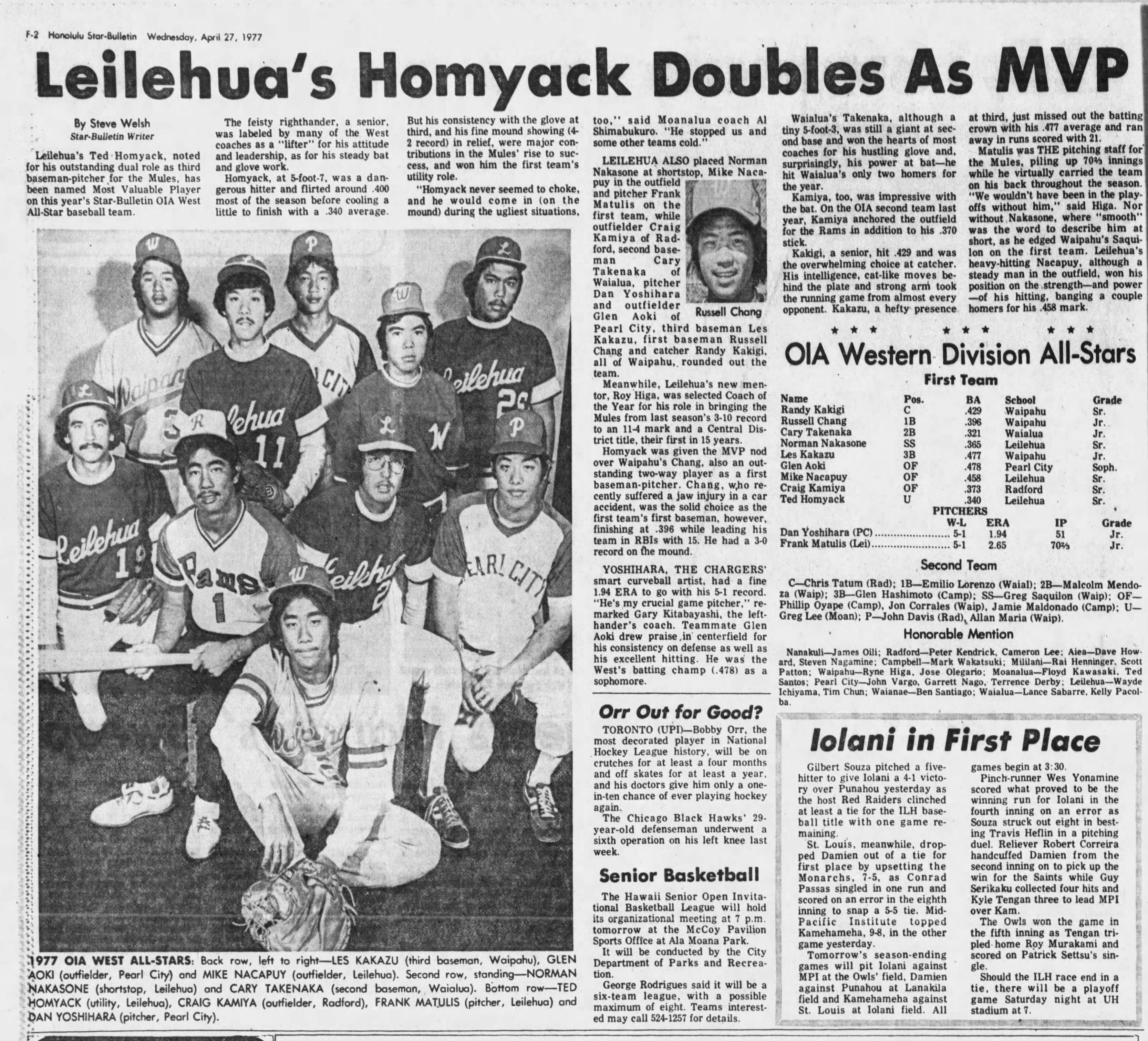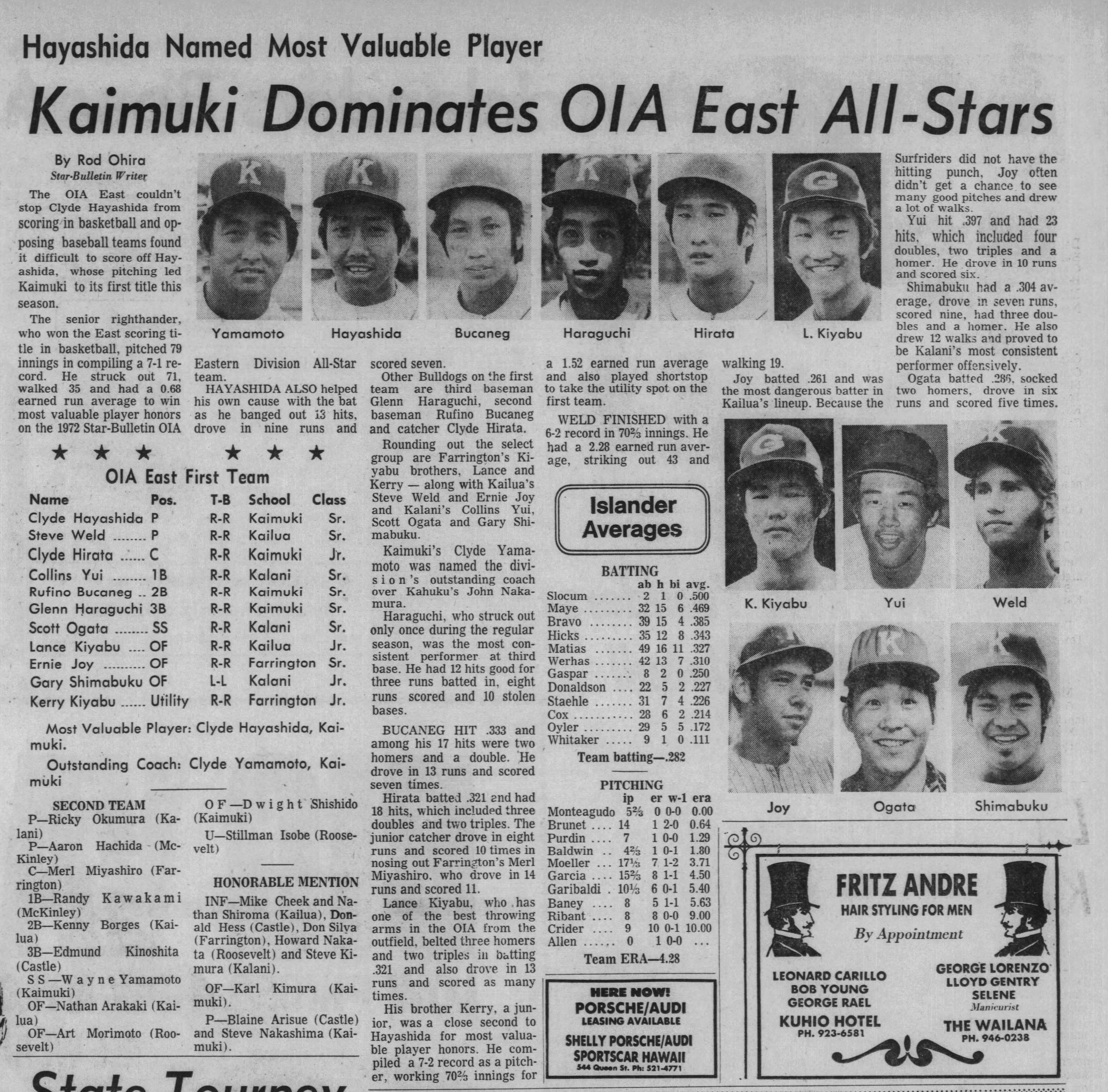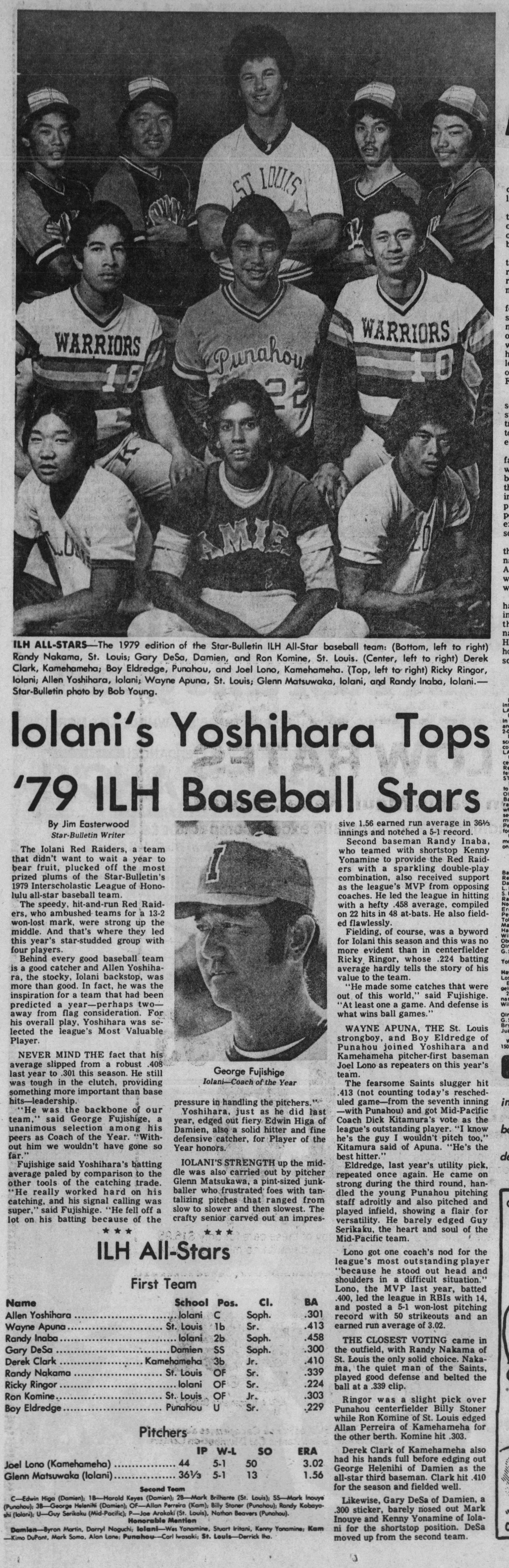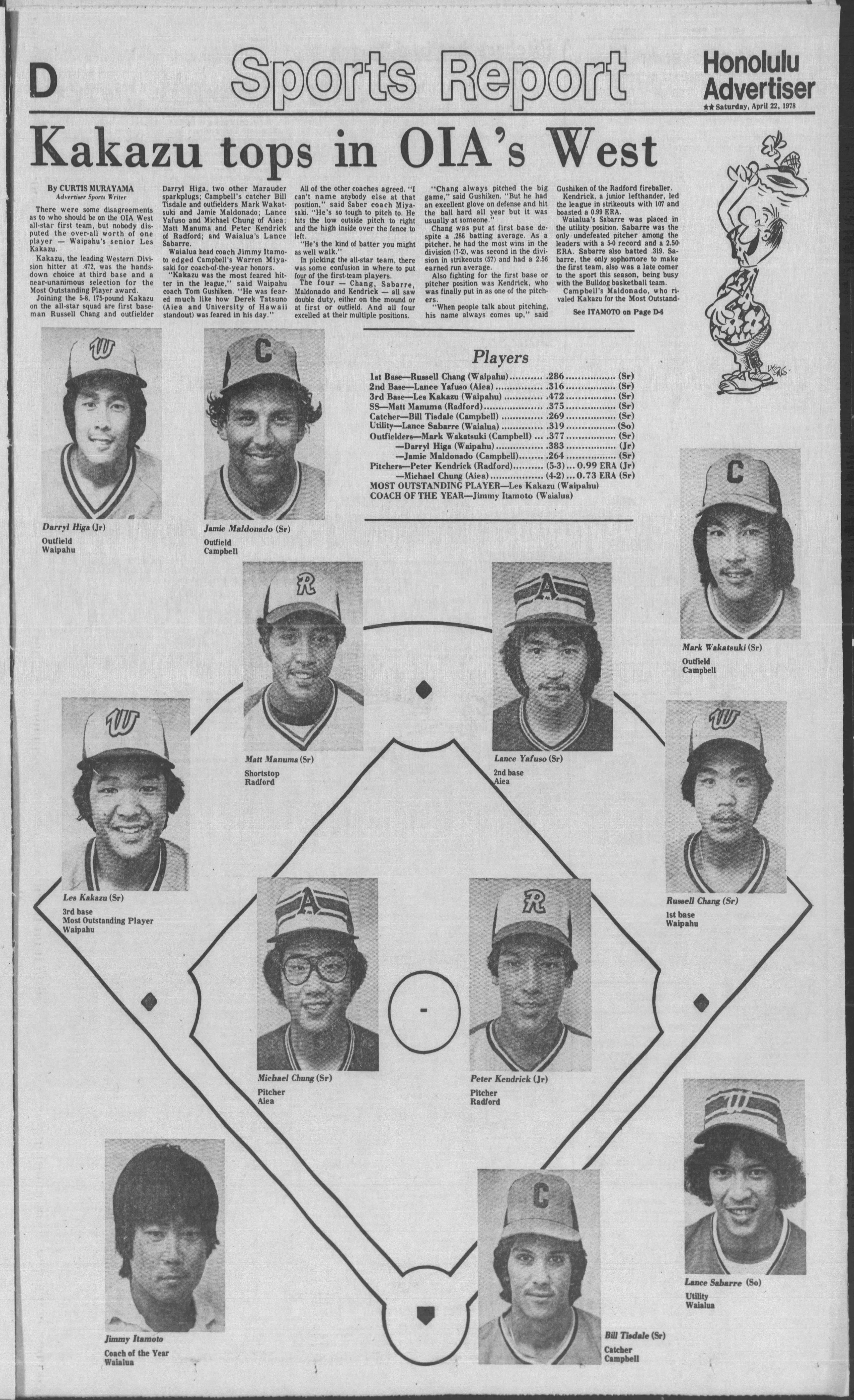 Check out names like Kalani’s Lenn Sakata, Roosevelt’s Dunn Muramaru after the ILH and OIA split, Vince Passas of Saint Louis, Punahou’s Mosi Tatupu, McKinley shortstop Eric Tokunaga, Burton Coloma of Waialua, Damien’s Joey DeSa and Kelly Sur of McKinley.