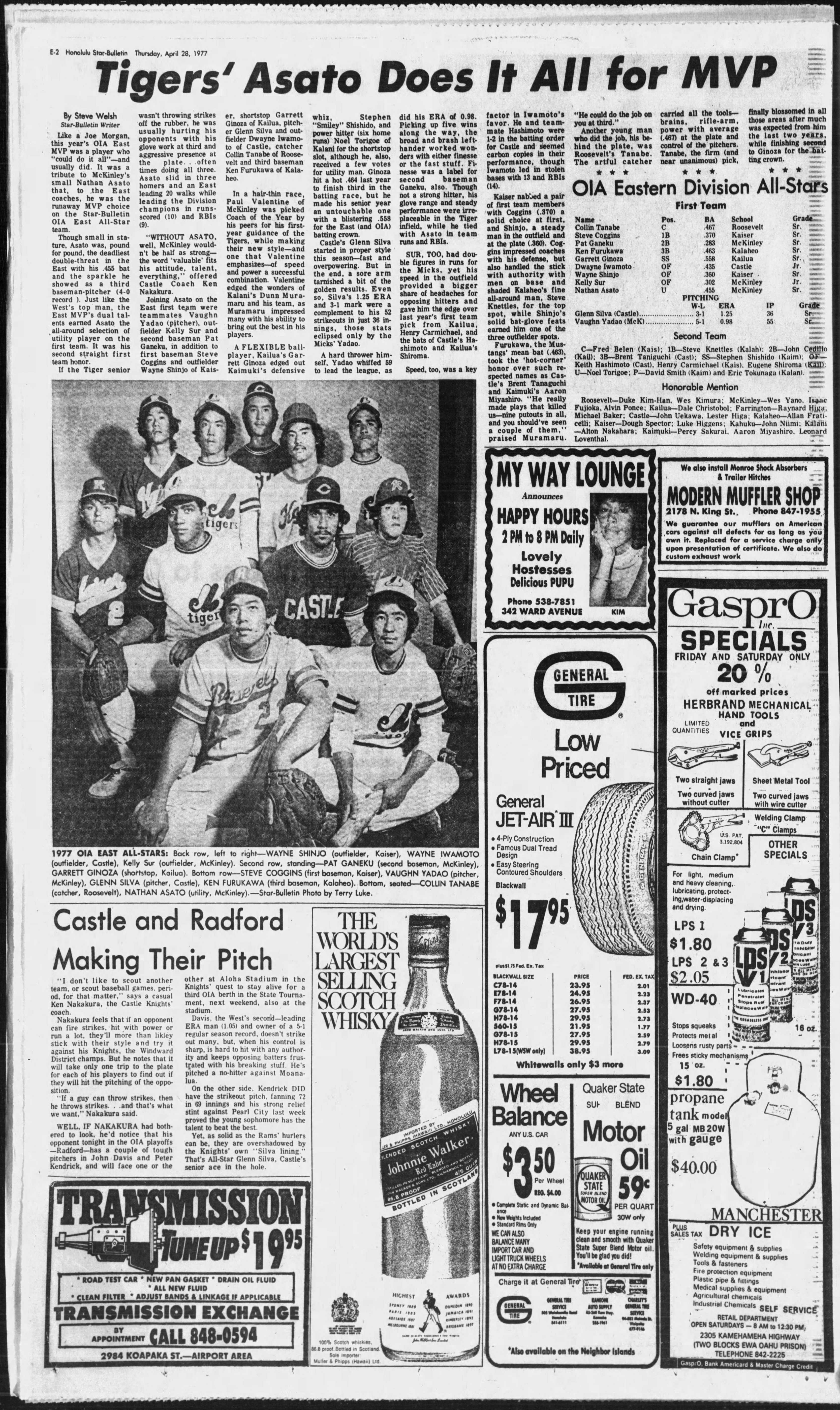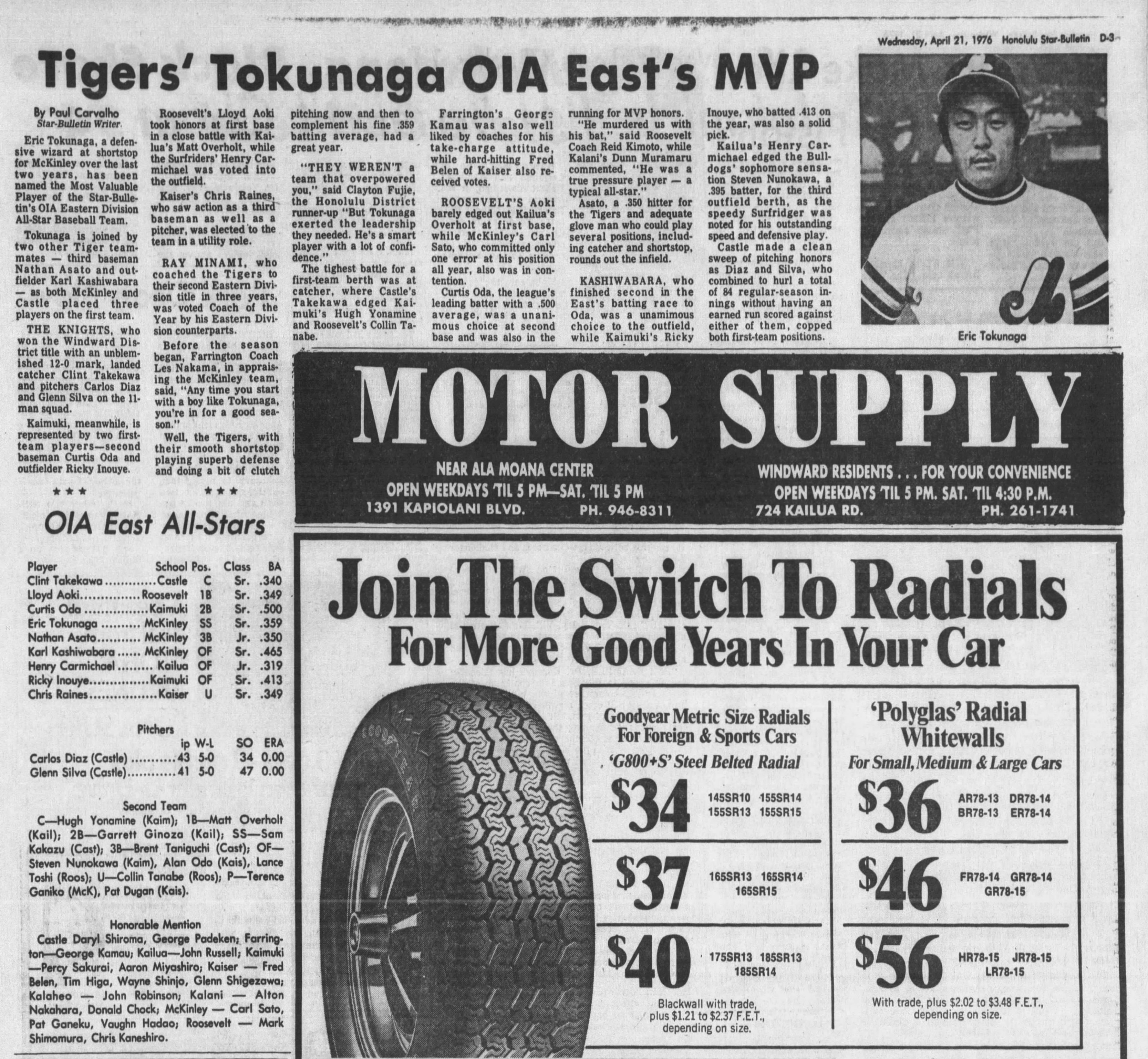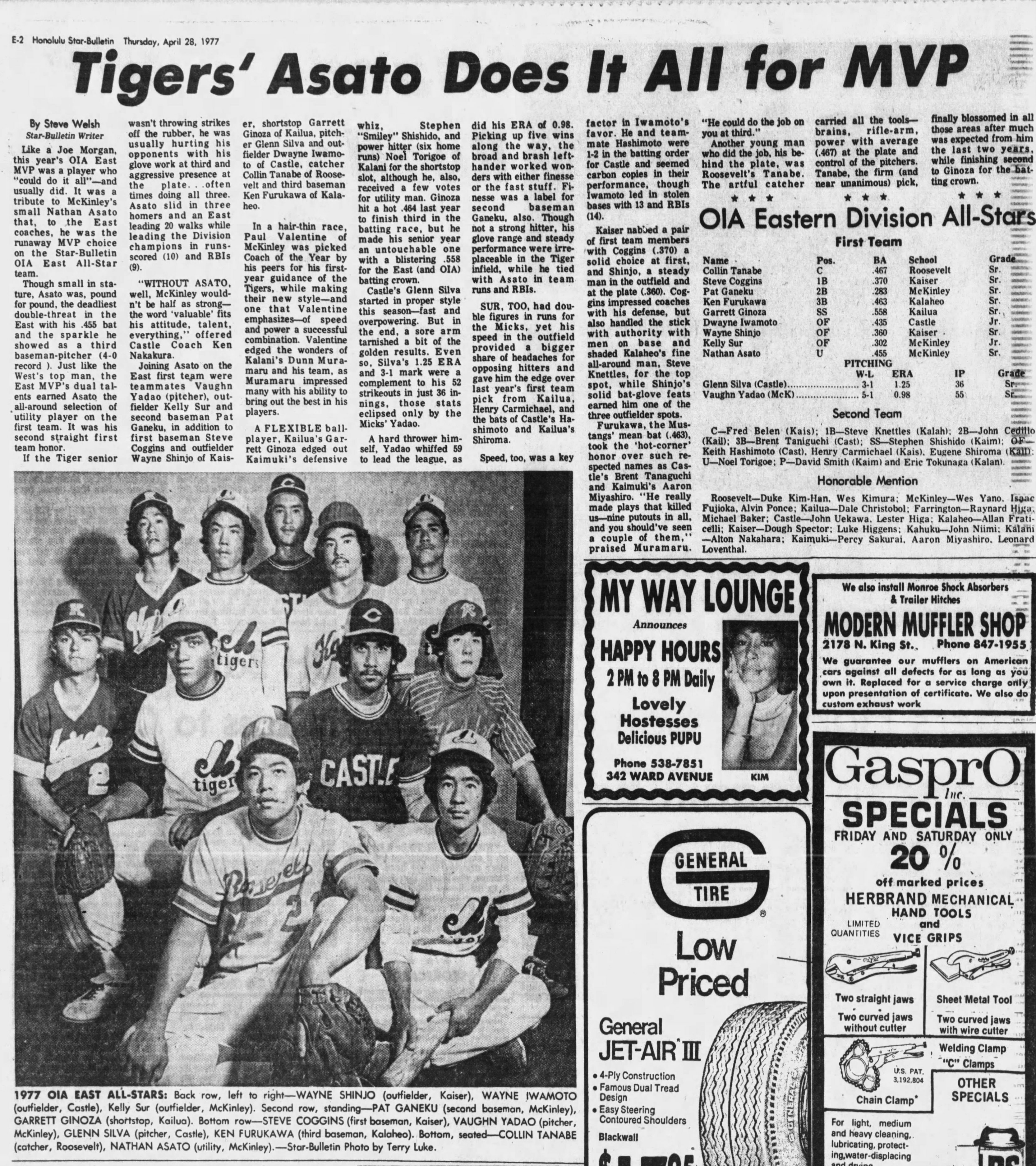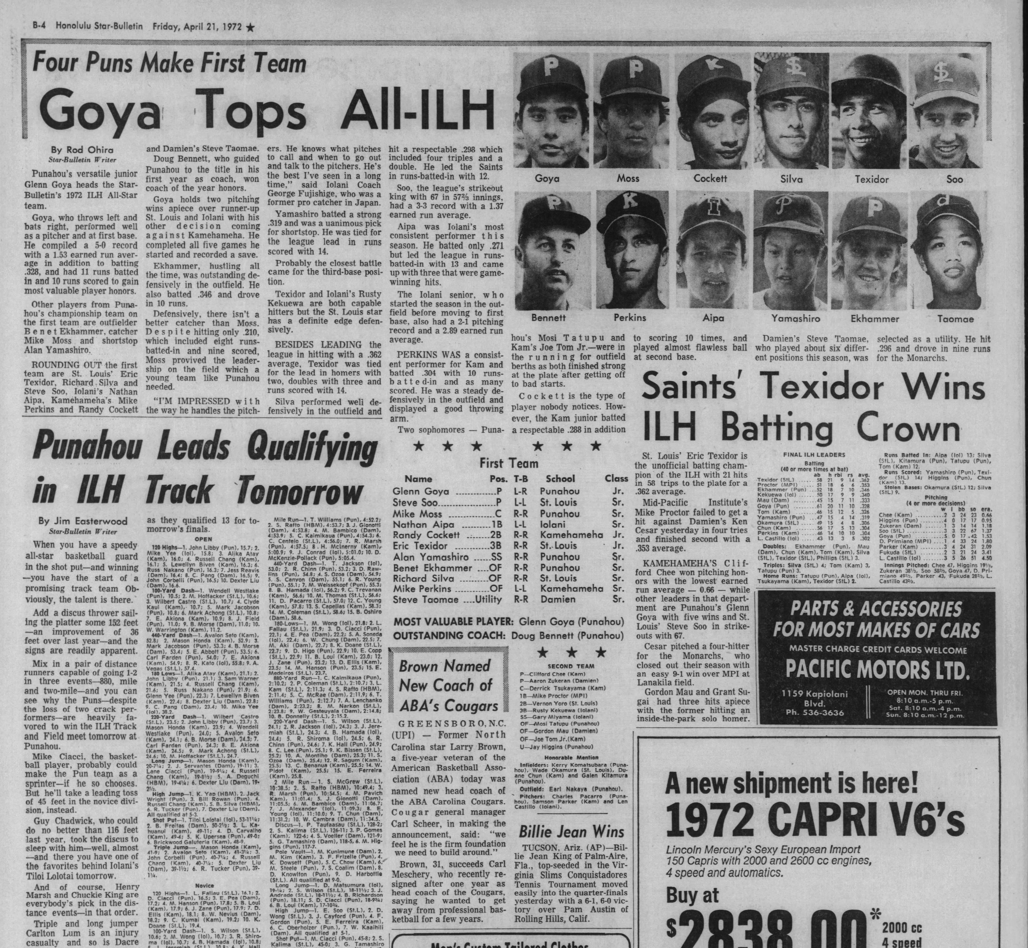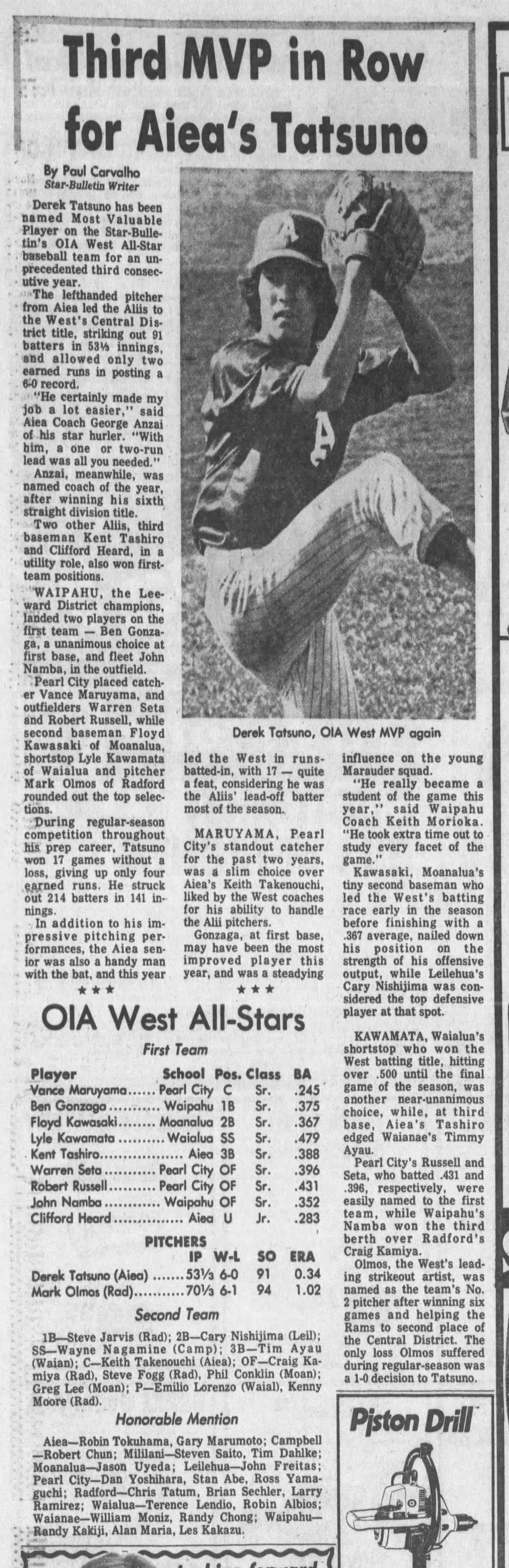 Check out names like Kalani’s Lenn Sakata, Roosevelt’s Dunn Muramaru after the ILH and OIA split, Vince Passas of Saint Louis, Punahou’s Mosi Tatupu, McKinley shortstop Eric Tokunaga, Burton Coloma of Waialua, Damien’s Joey DeSa and Kelly Sur of McKinley.