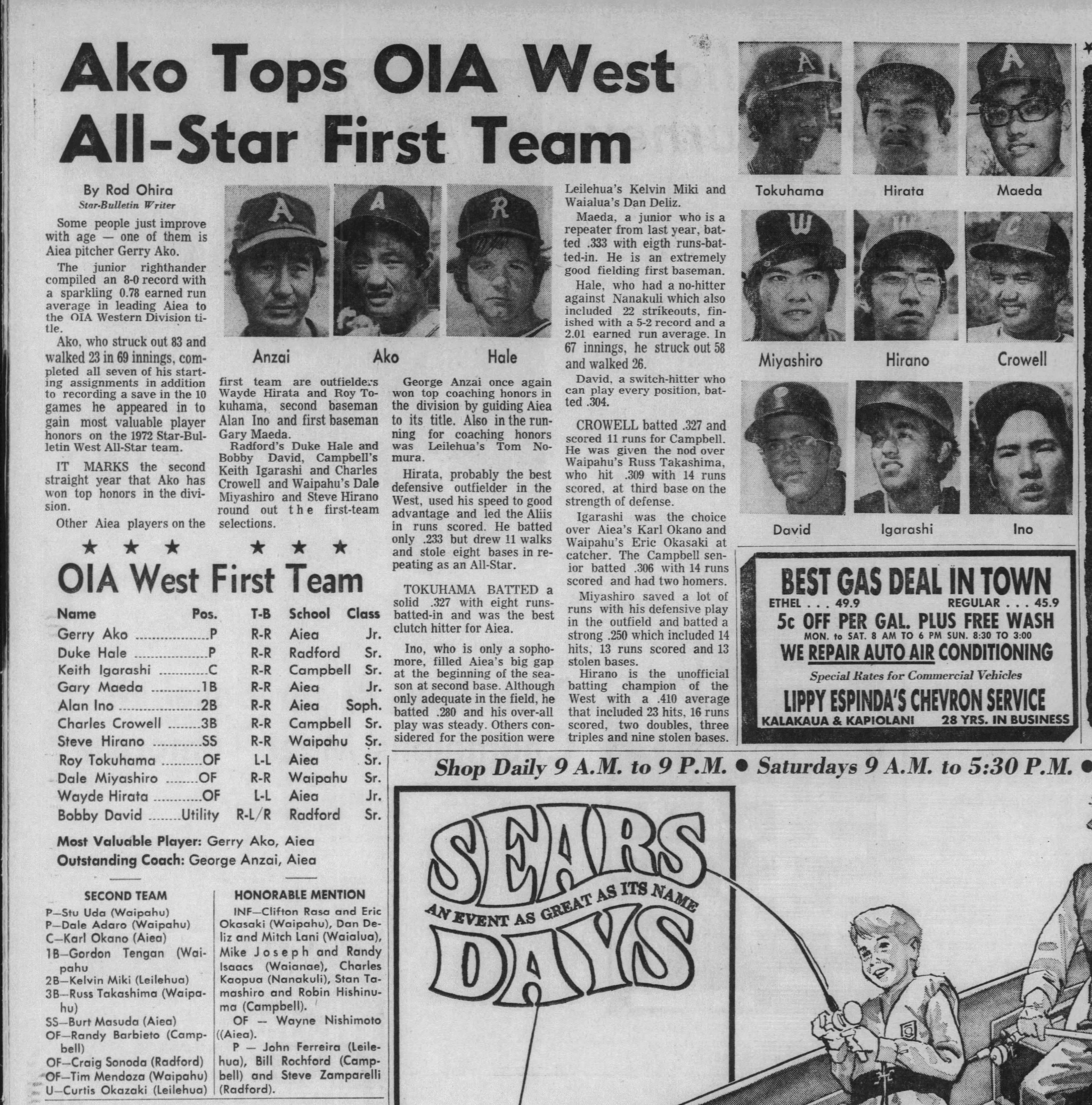 The list of big stars has to begin in the OIA with Aiea, which featured both Gerald Ako and Derek Tatsuno on the hill. But Punahou’s Glenn Goya was no slouch in the year between them.