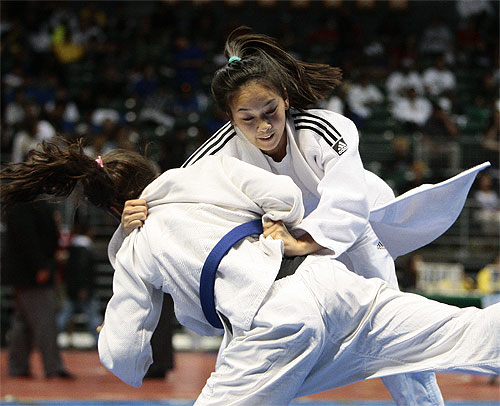 SPT – Punahou’s Chrissy Chow, top, gains control of Kamehameha-Kapalama’s Kianna Borengasser in the 129-pound bout of the HHSAA State Judo Championship on Saturday, May 7, 2011 at Stan Sheriff Center in Manoa. (Jamm Aquino/Honolulu Star-Advertiser).