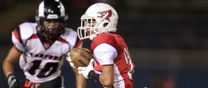 2013 September 6 SPT – Kalani’s Blaise Manabe looks for extra yards after making the catch in their game against Radford at the Kaiser High School field. PHOTO BY DARRYL OUMI / SPECIAL TO THE HONOLULU STAR-ADVERTISER.