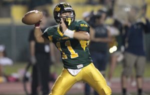 Leilehua’s Kona Andres (11) throws the football during the first half of an OIA football game between the Moanalua Menehune and the Leilehua Mules Friday, October 9, 2015 at Leilehua High School in Wahiawa.